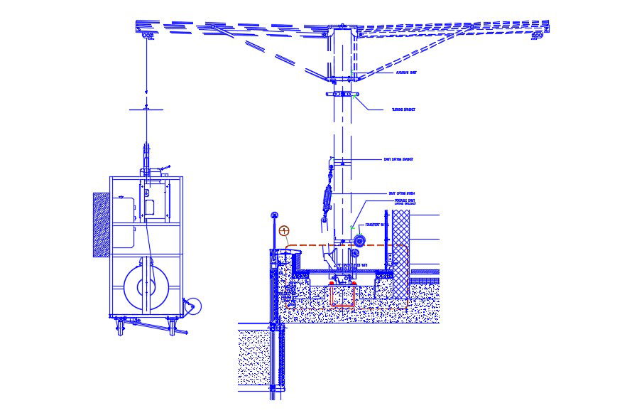 AutoCAD Drawing details of shade truss design that shows machinery units, turning bracket, davit lifting bracket, lifting winch, transport wheel, pit cover, anchor plate, and various other unit details download cad file for free.