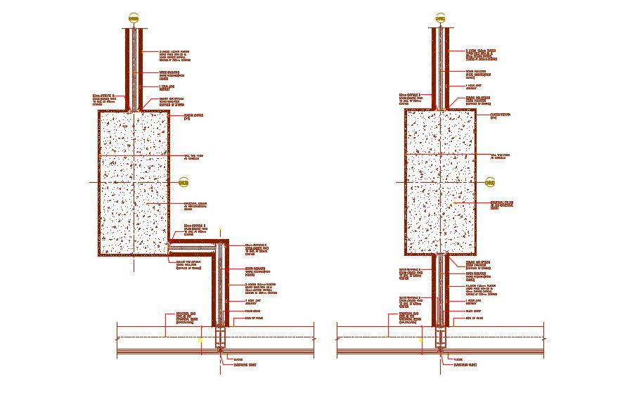 2d CAD drawing Reinforced concrete cement (RCC) wall design that shows RCC work details along with structural slab, glazing, plaster stopper, wall finish, filler board, sound insulation, and various other units details download AutoCAD file.