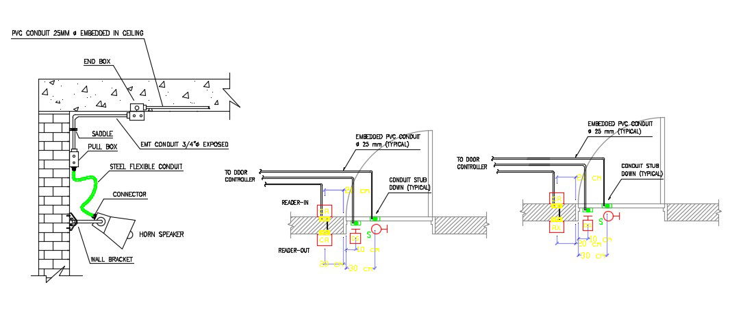 Horn Speaker installation design that shows brick wall design along with PVC conduit, pull box, saddle, steel flexible conduit, connector, wall bracket, and various other units details download CAD file for free.