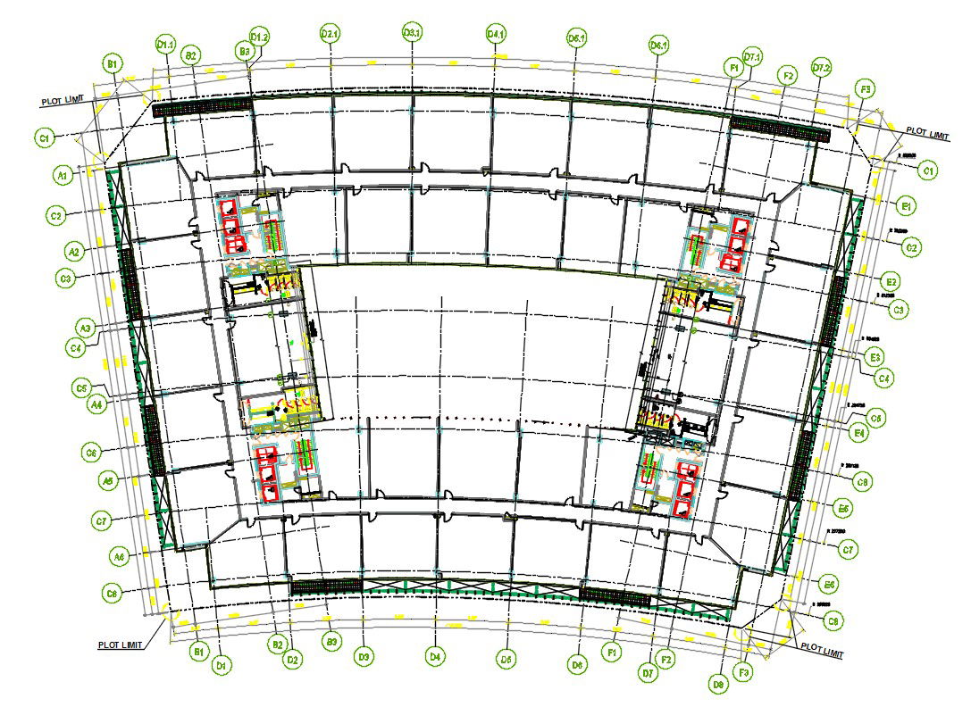 Commercial Building Layout Plan Free Download DWG file; 2d CAD drawing of office building floor plan with office rooms, the huge entrance gate, staircase, lift facility, bathrooms, and all side dimension details in AutoCAD format.