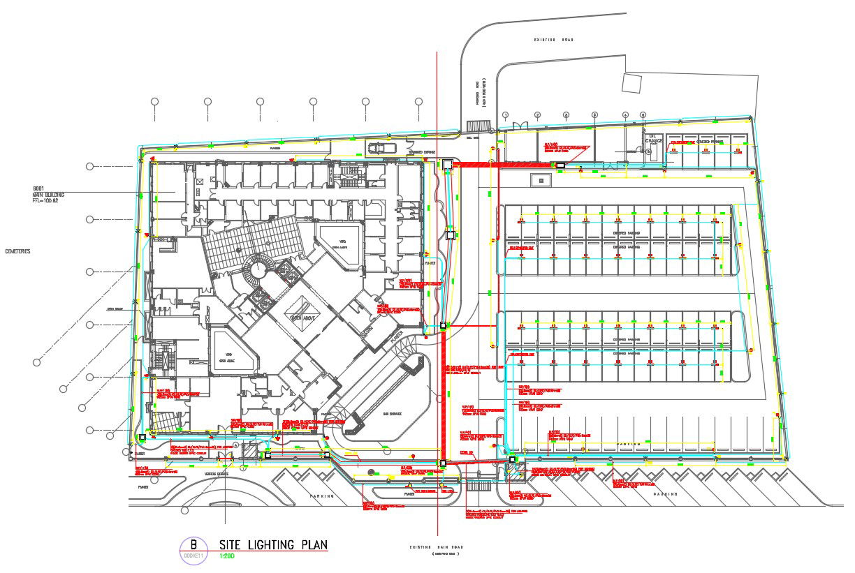 Commercial Building Floor Plan With Parking AutoCAD File; this is the commercial building floor plan with covered and open parking, for parking allotted one plot, and in the main building huge main entry with a plantation, drop off zone, security cabin, the reception area is double-height, circular stair and lift lobby, many offices, toilet blocks, service area, big passages and much more,this is the DWG file.
