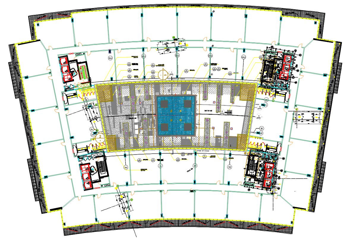 Commercial Building Floor Plan AutoCAD File; the architecture commercial building office floor plan CAD drawing shows the huge main entry, open space in building center, stair and lift lobby, admin area, big canopy, at the front side, plantation design and working drawing with dimension details in AutoCAD format.