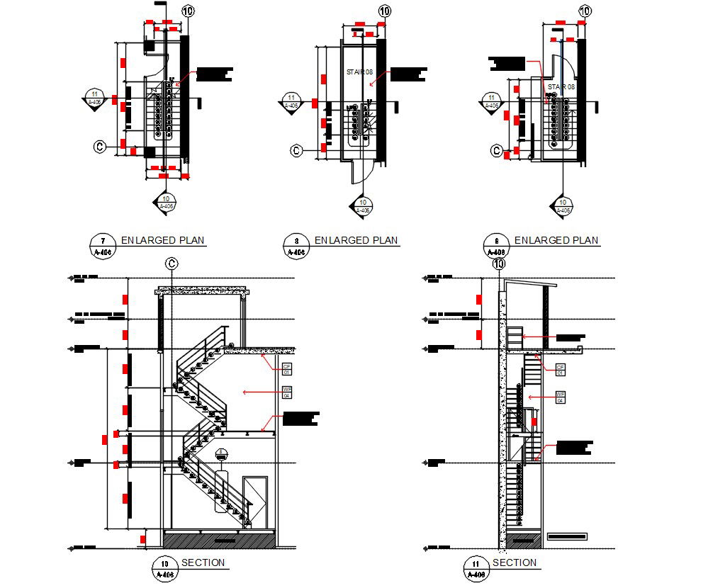 Staircase Plan AutoCAD Drawing; download DWG file of staircase plan and section drawing shows riser and tread details, railing design, landscaping platform, leveling, RCC structure, and dimension details.