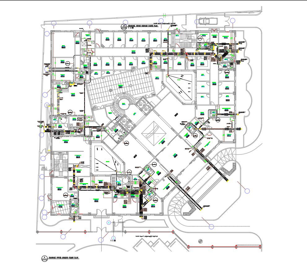 2D Drawing Pipe Drainage System AutoCAD File; this is the drainage pipe system in a commercial building of ground floor plan, its a CAD file format.