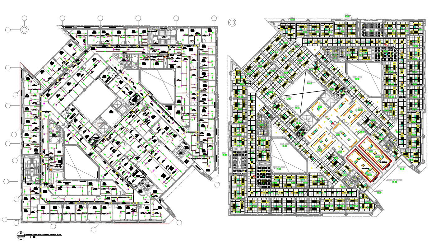 Duct Ac System And Fire System AutoCAD File; this is the two plan of commercial buildings one is the AC ducting system and the second is the fire system, central AC ducting detail in this plan, it's on the second-floor plan, this is the AutoCAD file format.