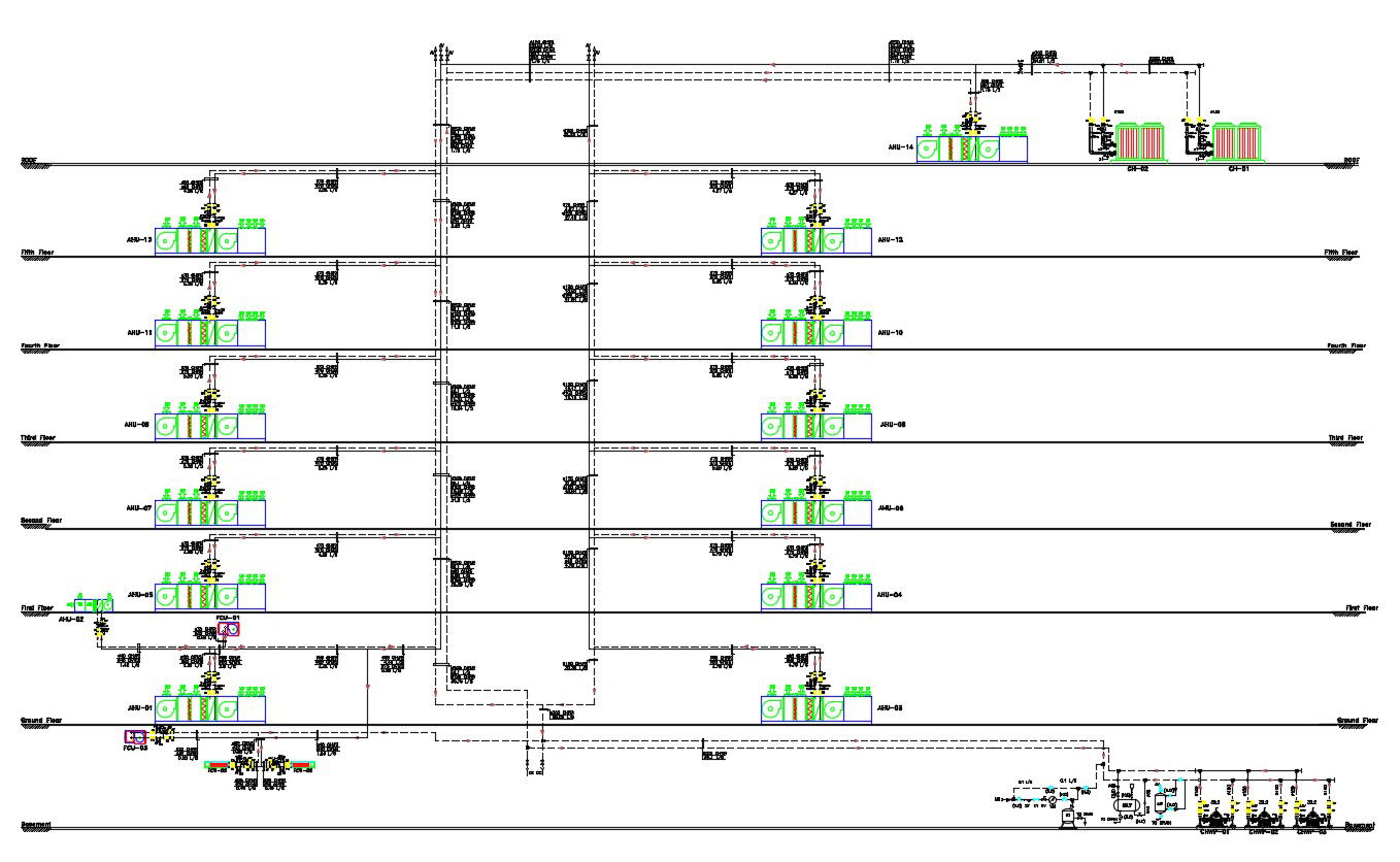 Chilled Water System Diagram AutoCAD File; this is the chilled water system diagram section with floor levels, texting, machinery detail on basement and terrace floor, its a DWG file format.
