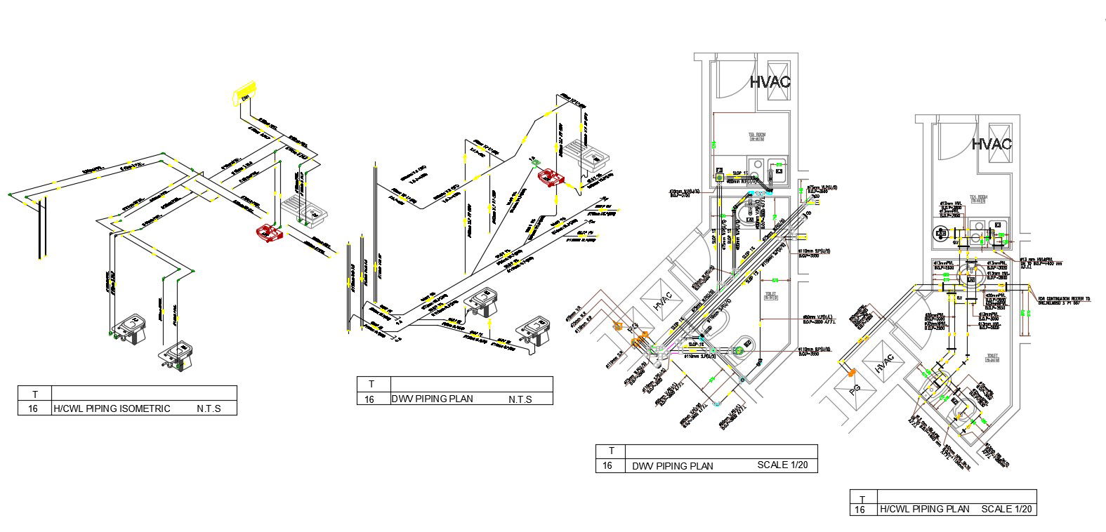 2D CAD Drawing Modern Washroom Design AutoCAD File; this is the planning of two toilets sanitary includes counter basin, WC, detail in it, HVAC, DWV pipe details, some texting detail, also isometric view of HVAC and DWV pipe detail, this is the CAD file format.