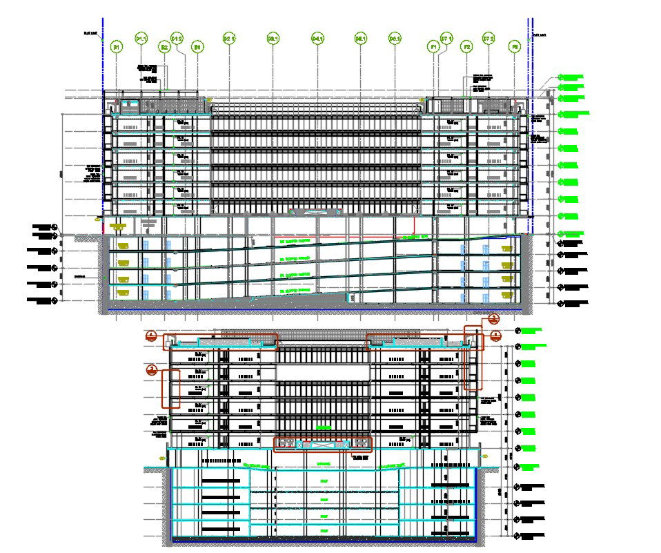 Sectional Elevation Of Commercial Building AutoCAD File; this is the sectional elevation of commercial building includes centerline in section, floor levels dimension, ramp section in the basement, wall section details, and much more other detail related to section, its a CAD file format.