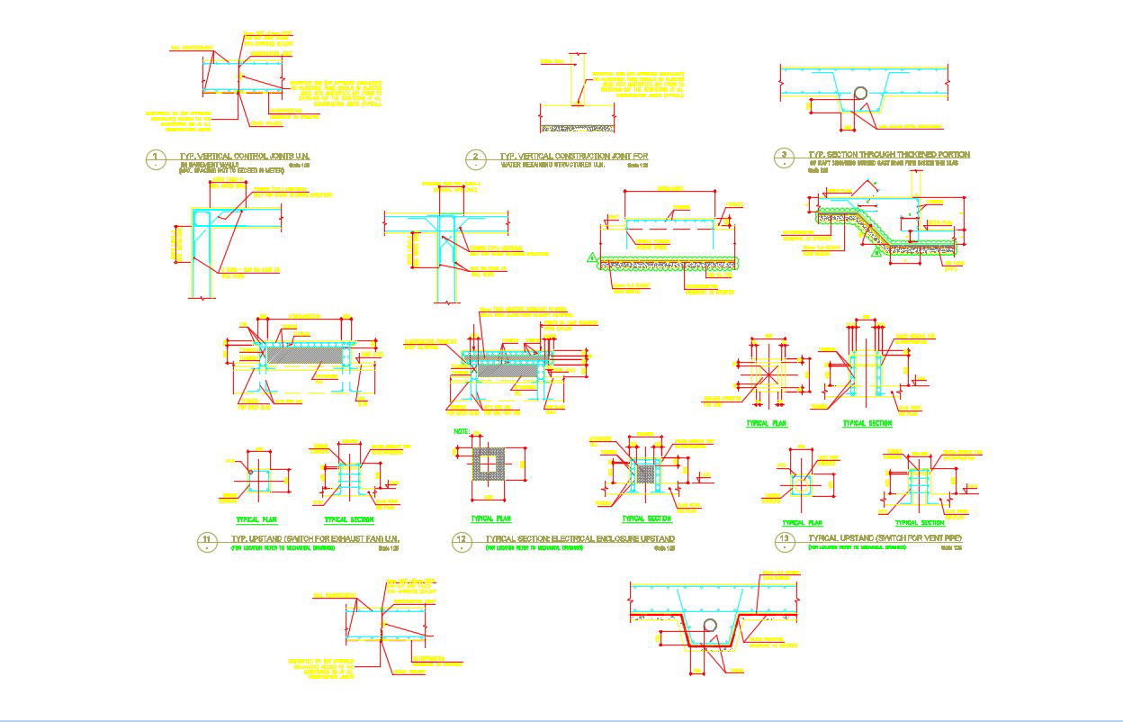 2D CAD Drawing Concrete Beam Design AutoCAD File; this is the detail of the stair structure includes vertical control joint, vertical construction joint for water retaining structure, section through a thickened portion of the raft, type of upstand UN, typical section electrical enclosed upstands, and much more other detail, this is the DWG file.