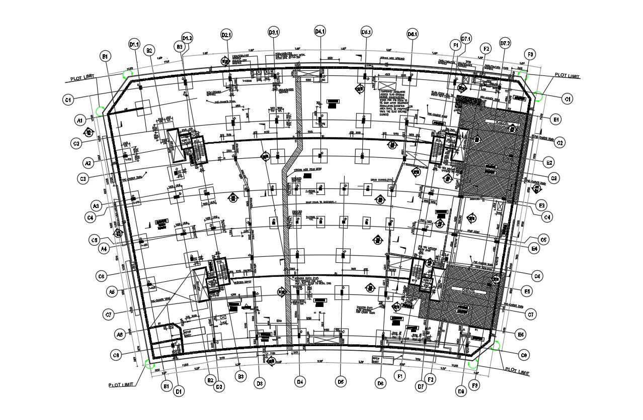 Commercial Building Center Line Plan And Foundation Plan DWG File; this is the foundation detail of the commercial building includes centerline, working dimension, columns nos, texting details, cutout in the slab, stairs and lifts details, hatching in some parts, and demarcation for plot limits, its an AutoCAD File format.