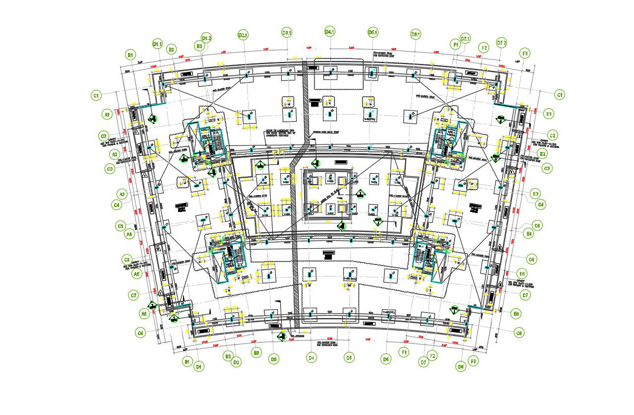 Column Foundation Plan With Centerline AutoCAD File; this is the column foundation plan of commercial building includes centerline, working dimension, column footing demarcation, retaining wall detail, texting about drawing, stair and lift details and a cutout in the plan it's a 2D CAD drawing format.