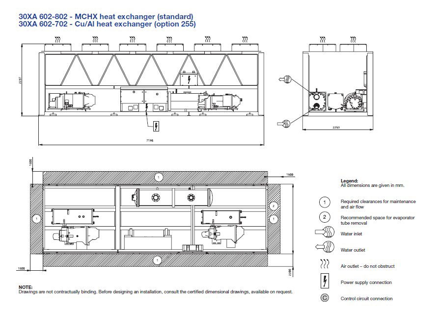 Working design of Air-Cooled Chillers Industrial Machine units that shows legends details along with machinery parts details of Compressor, Condenser, Evaporator, Expansion Valve, Power Panel, Controls unit, water box, and other units download PDF File for detailed explanation of Chiller machine.