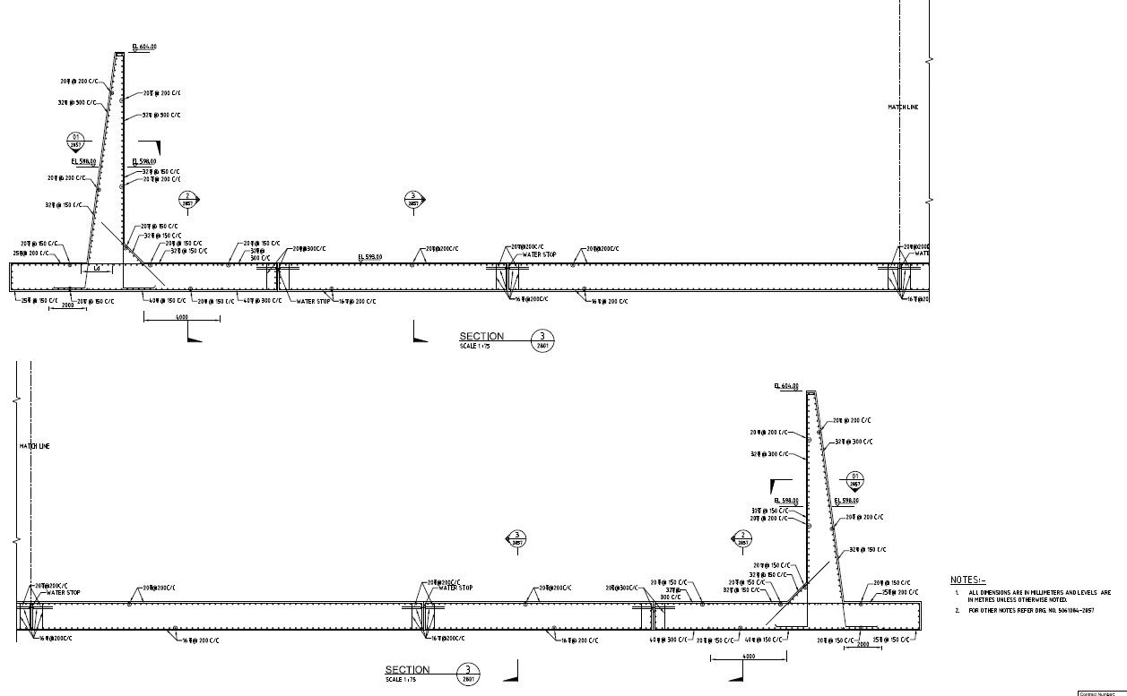 Cantilever retaining wall structure design that shows reinforcement details in tension and compression zone along with main and distribution hook up and bent up bars details. Retaining wall parts details of heel and toe slab, stem, backfill, and other units download PDF file for detailed design of cantilever retaining wall structure.