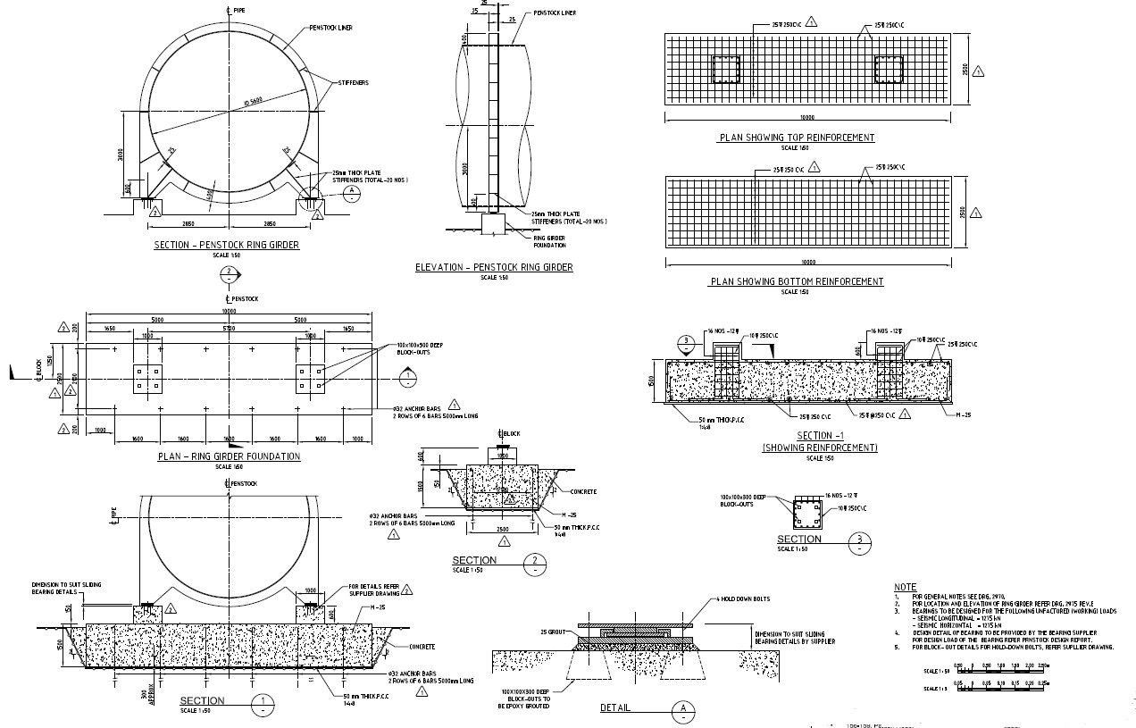 Plan elevation and section design of penstock ring girder unit along with combined footing design that shows reinforcement bars details in tension and compression zone, footing size, section line, RCC work, and various other structural blocks details download PDF File.