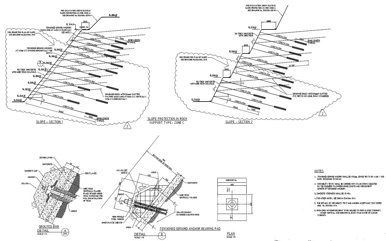 Constru8ction details of dam slope design that shows dimension working set, dam spillway, leveling, shotcrete thickness, RCC work details, concrete masonry, and various structure block details download PDF File for the detailed design of RCC dam spillway.