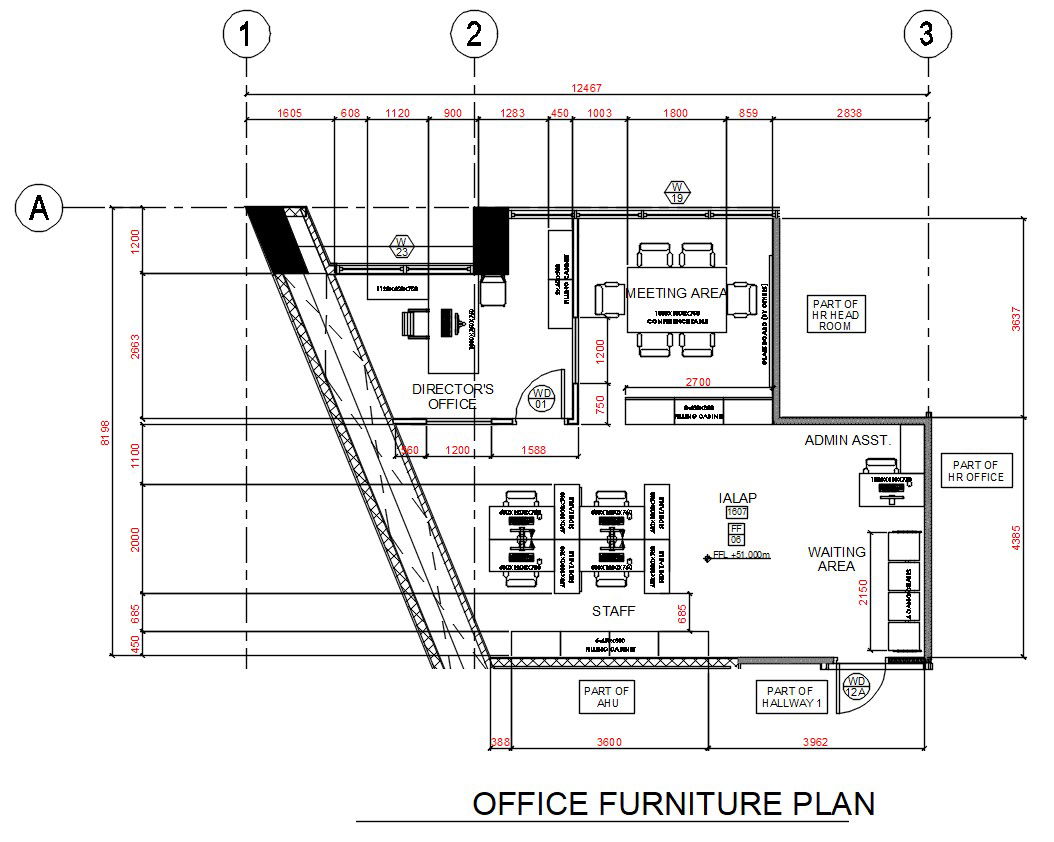 Director Office Furniture Plan AutoCAD File; the architecture office plan CAD drawing shows director cabins, meeting rooms, waiting area, admin assistant desk, and staff work desk with all furniture and dimension details in AutoCAD format.