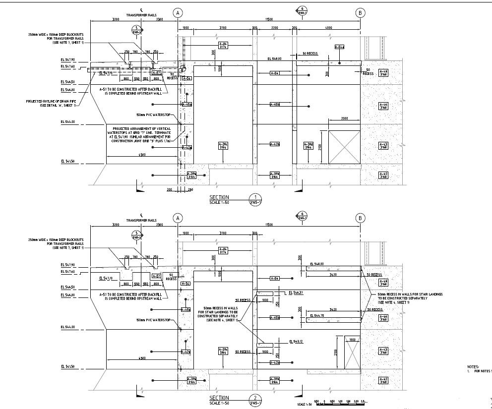 2d Design of powerhouse section drawing that shows elevators units, expansion, and contraction joint, PVC drain pipe, dimension set, PVC water stop, centerline, leveling, and various other units details download the PDF file for free.