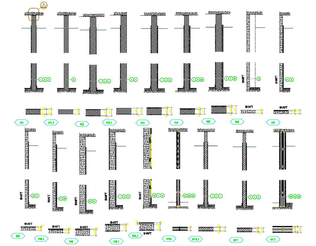 Wall Structure CAD Blocks; The wall structure drawing defined inside and outside the construction phase for each individual component like shaft wall, reinforcing steel, cement board, and concrete detail in AutoCAD format.