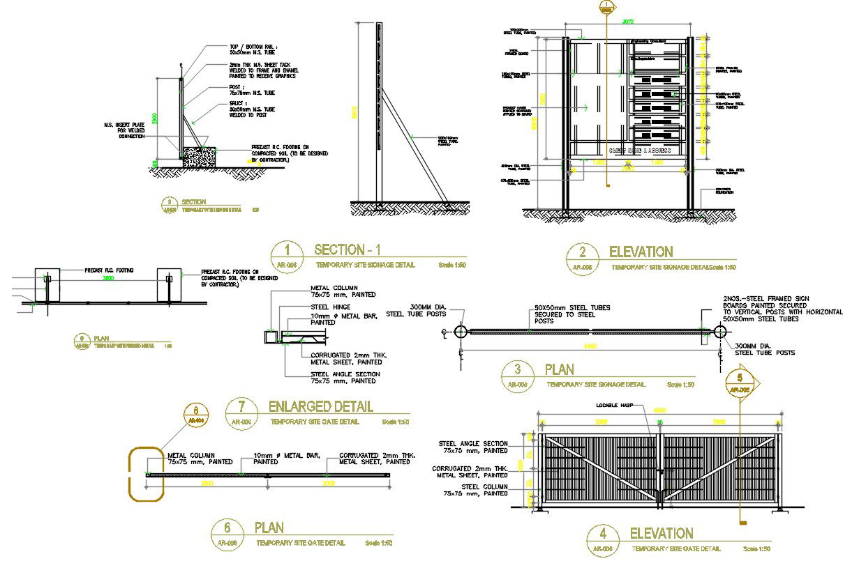 Temporary Site Gate AutoCAD Drawing; download free AutoCAD file of temporary site gate plan, front elevation design, both side column detail, and contractor site nameplate detail in AutoCAD format.
