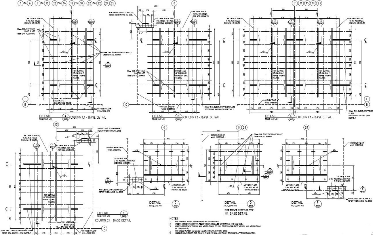 Structure Design Of Column Base Plate PDF File; this is the structure detail of column base plate includes dimension detail, steel detail, texting about drawing, bars details and much more other details related to the structure, its a PDF file.