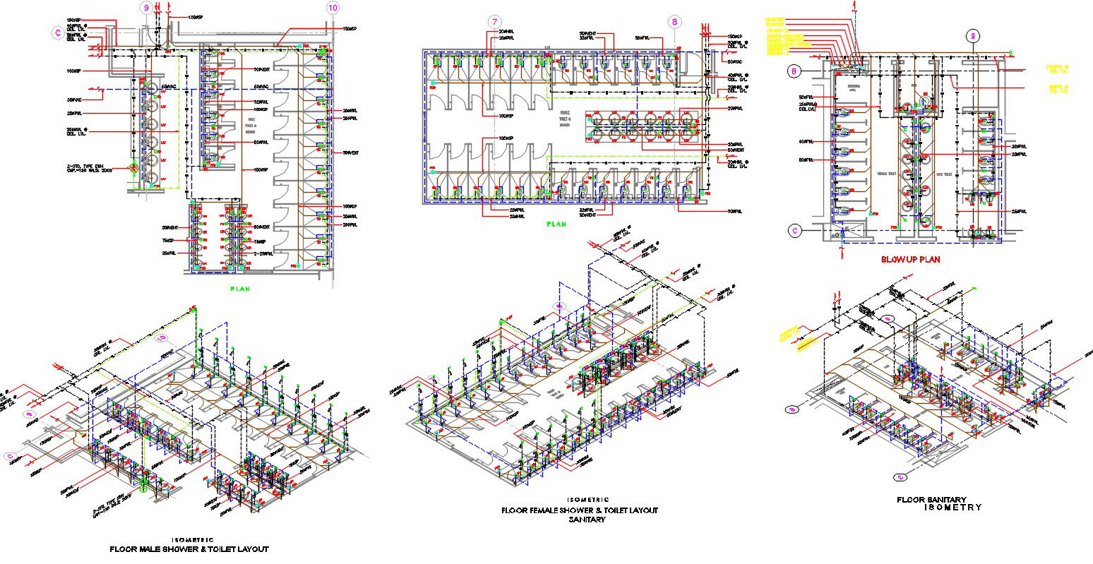 Shower And Toilet Layout Plan AutoCAD File; the clubhouse bathroom isometric elevation, latout plan, and section CAD drawing shows a passage, sanitary equipment installation details, doors and ventilation details, plumbing details and interior design with all dimension details.