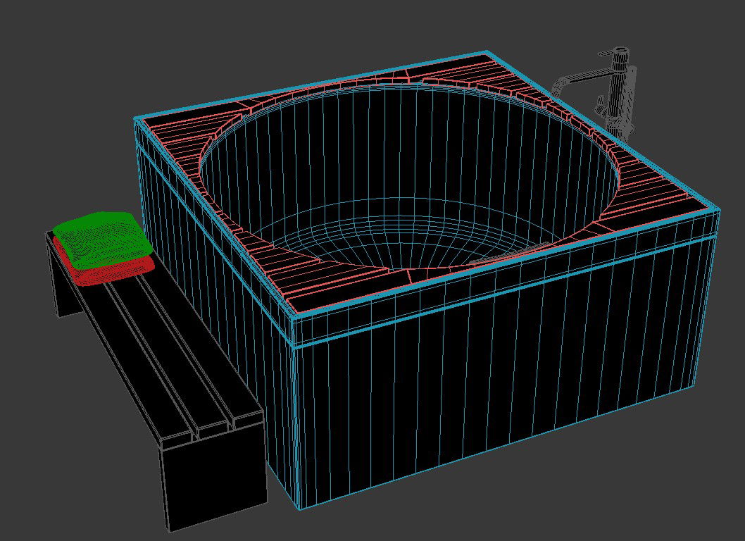 3D Circle Bathtub MAX File; download free 3d MAX file of circle bathtub with water tap and wooden table isometric elevation design.