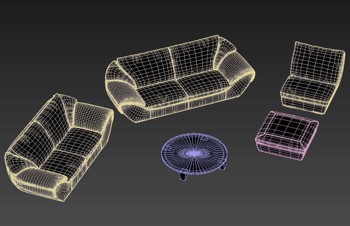 Modern Sofa Set Design With Round Shape Center Table And Puffy 3D MAX File; this is the whole set of sofa includes one, two, and three-seater sofa, puffy,and round-shaped center table, this is the rendered drawing in 3D MAX file.
