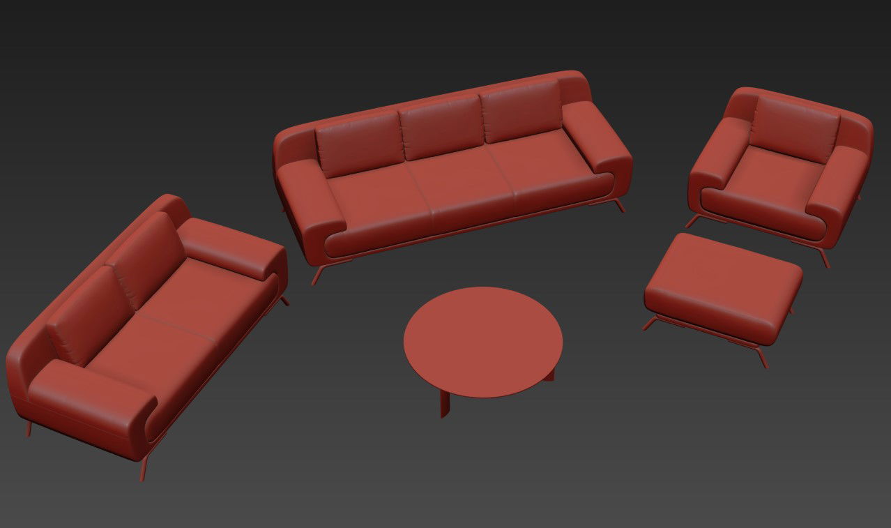 Sofa Set With Round Shape Center Table 3D Model Free Download; this is the one, two, three-seater sofa with round shape center table, puffy, the sofa is totally form-based and semi-round hand rest , legs are made in SS, this is the basic rendered drawing in 3D MAX File.