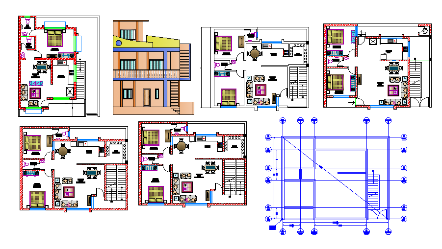 All room tye of drawing room, bed room, dining area & kitche furniture lay-out with elevation detail & design.