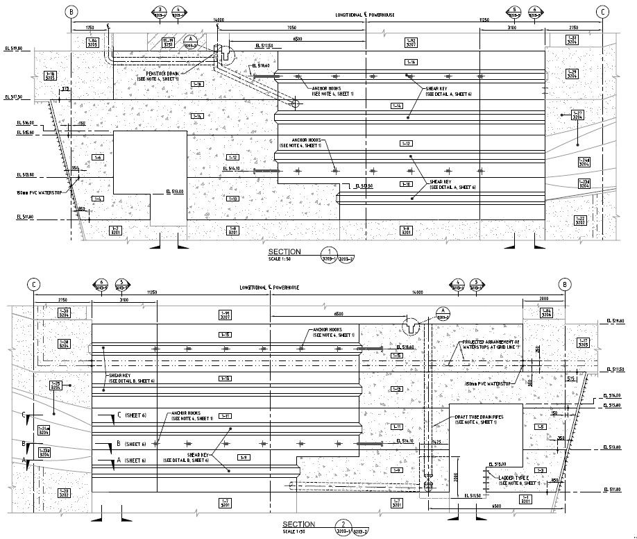 Sectional details of powerhouse working layout that shows retaining wall arrangement details along with penstock, dimension working set, centerline, RCC work, Shear key, draft tube, drain pipe, water stop arrangement, and various other blocks details download the PDF file.