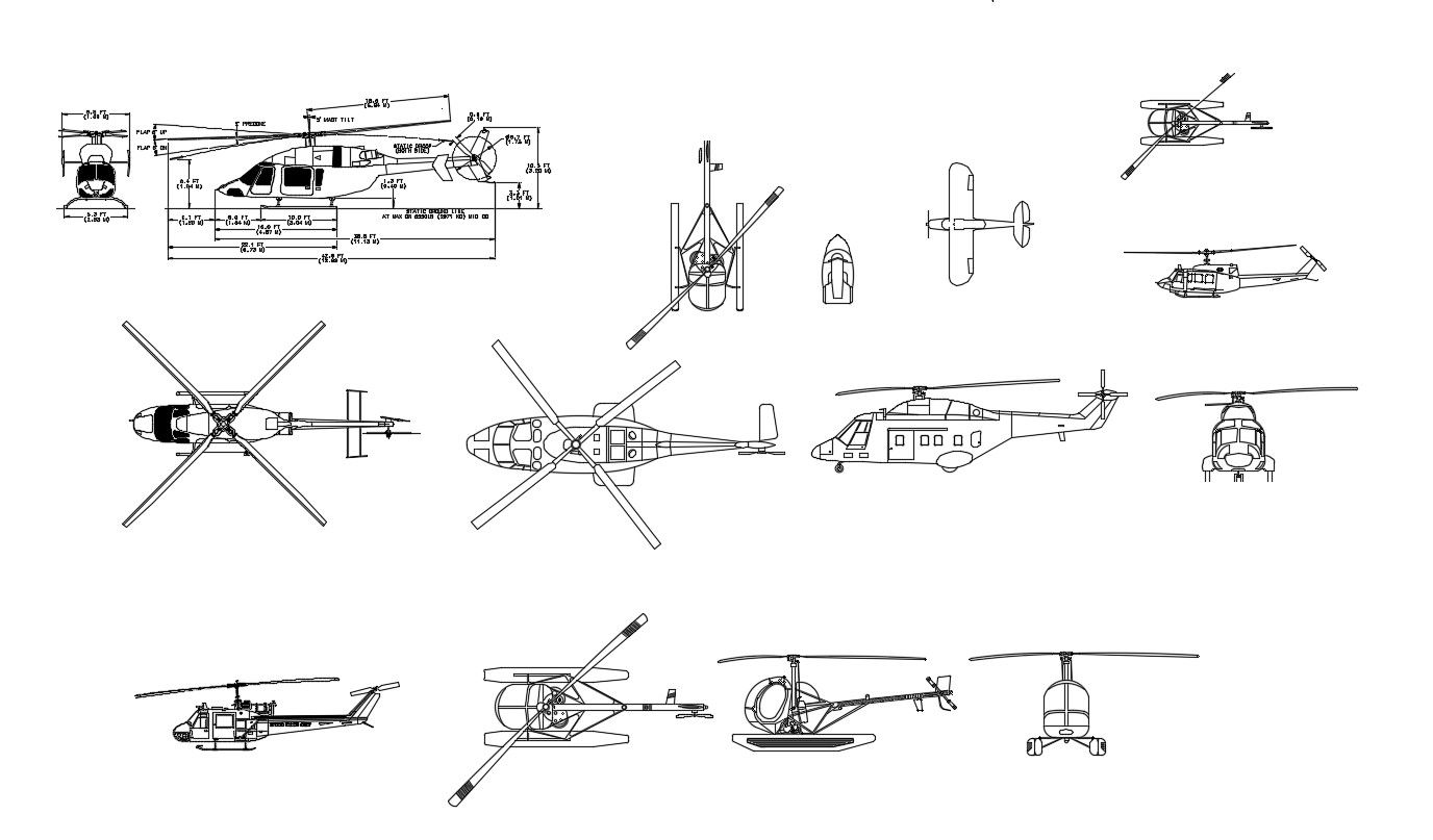 Helicopter 2D Cad Architecture DWG Files Free Download; plans of many helicopters and all dimension of the helicopter, this is the CAD file free file.
