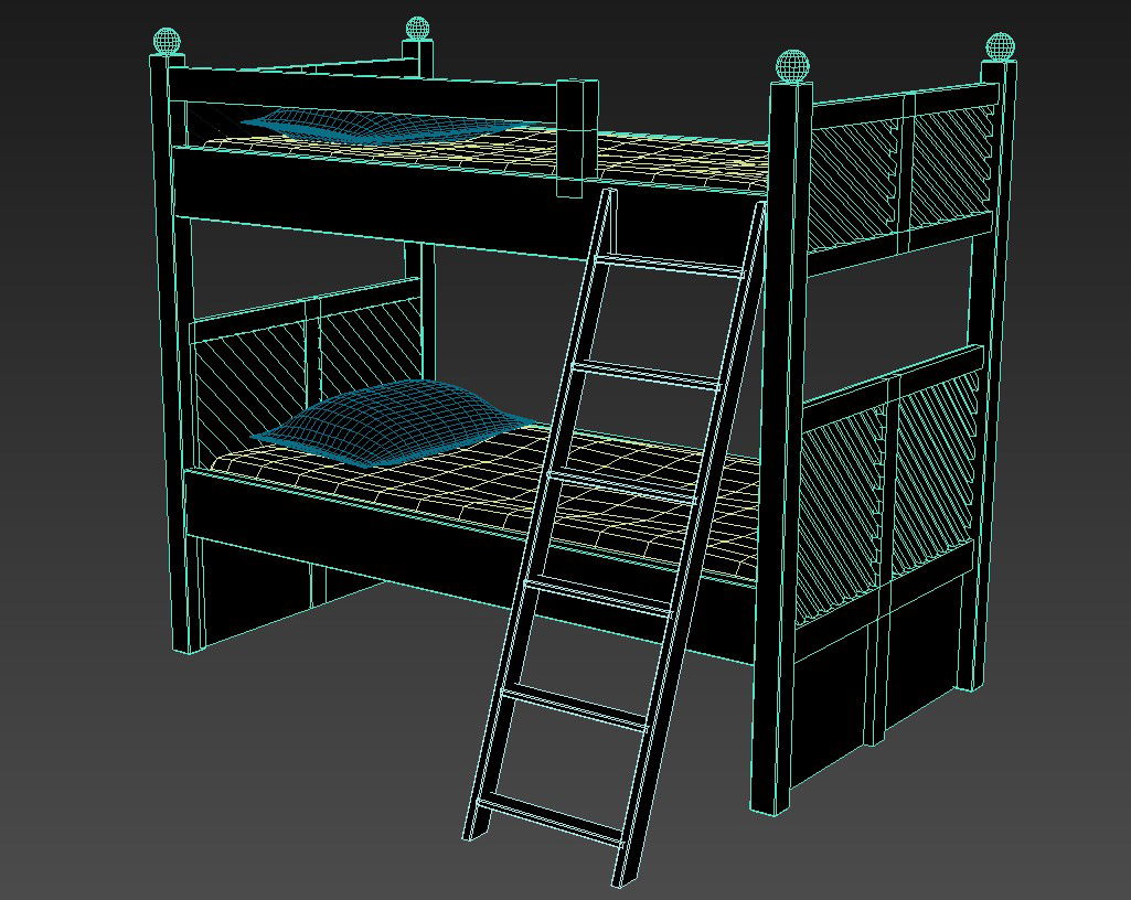 3D Bunk Bed For Kids MAX File; 3d model of bunk bed for 2 kids with stair and mattress and pillow isometric elevation design. The kids' bed is made with high-quality wood.