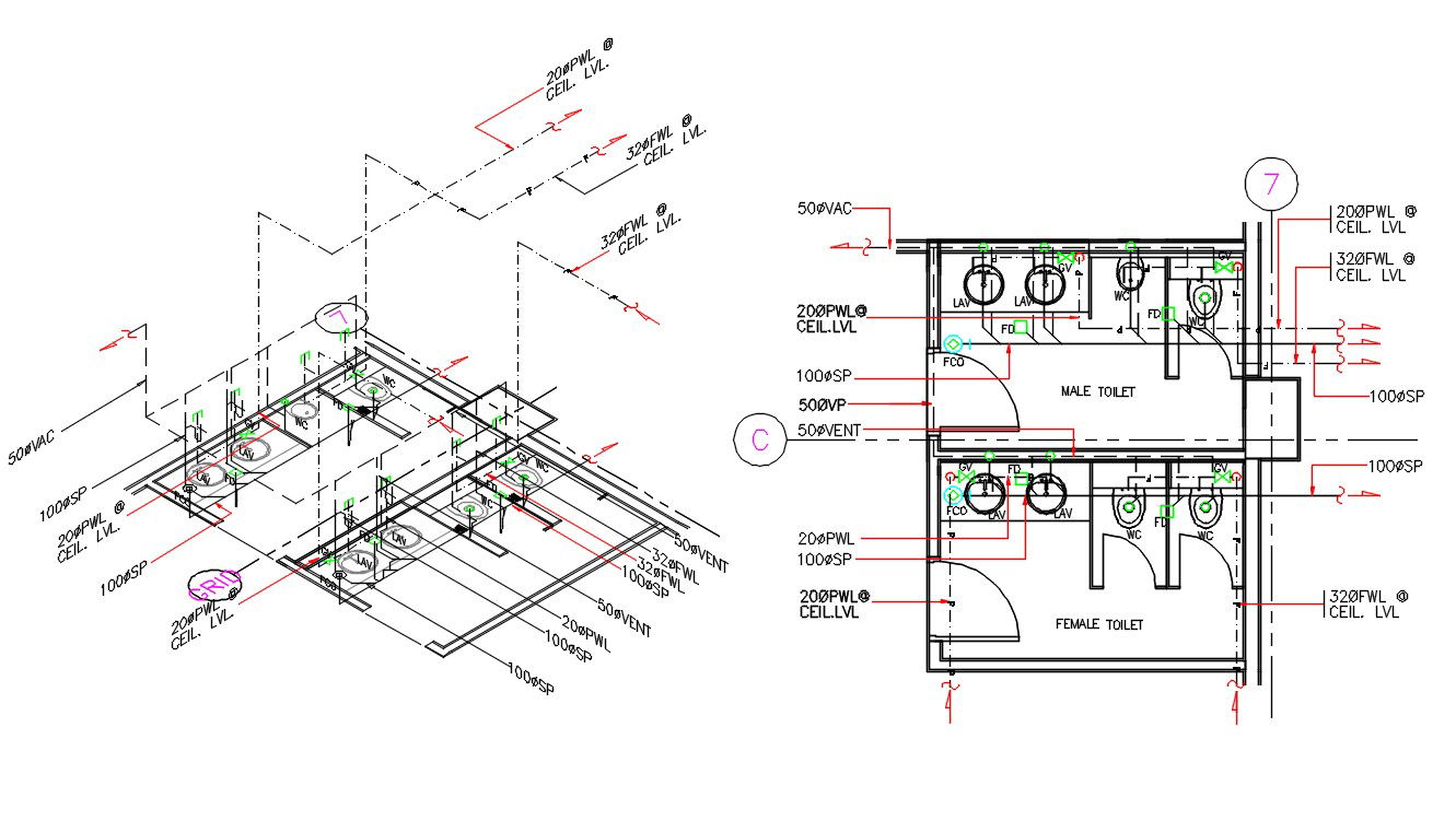 Male And Female Toilet Plan With Isometric CAD Drawing; the public toilet of male-female AutoCAD drawing shows floor plan, sanitary ware, plumbing detail, and isometric elevation design. download DWG file of toilet CAD file and get more detail about plumbing pipe isometric design.