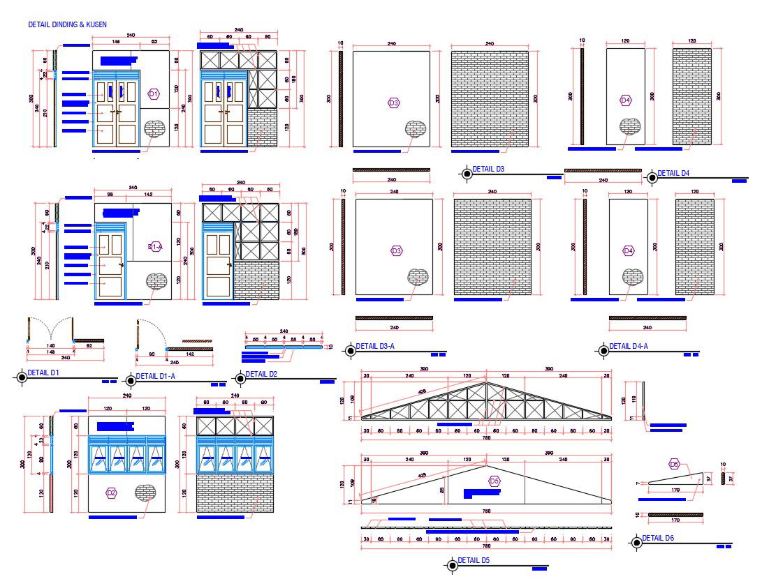 Construction Drawing Of Truss Roof Building AutoCAD File; 2d CAD drawing of building construction detail shows red brick wall, plaster, wooden truss roof, door, and window elevation design with all dimension details.
