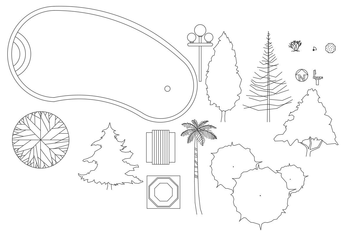 Download Free Garden Blocks DWG File; download free AutoCAD file of garden CAD blocks includes street light, fountain, benches, small pond, tree, and plant.