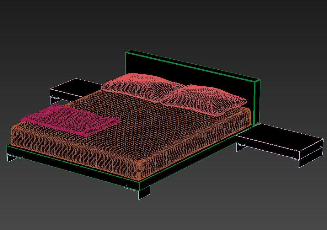 3D Wooden Double Bed Design With Side Table MAX File; download free 3d max MAX file of double bed design with side table, backrest, and mattress isometric elevation design.