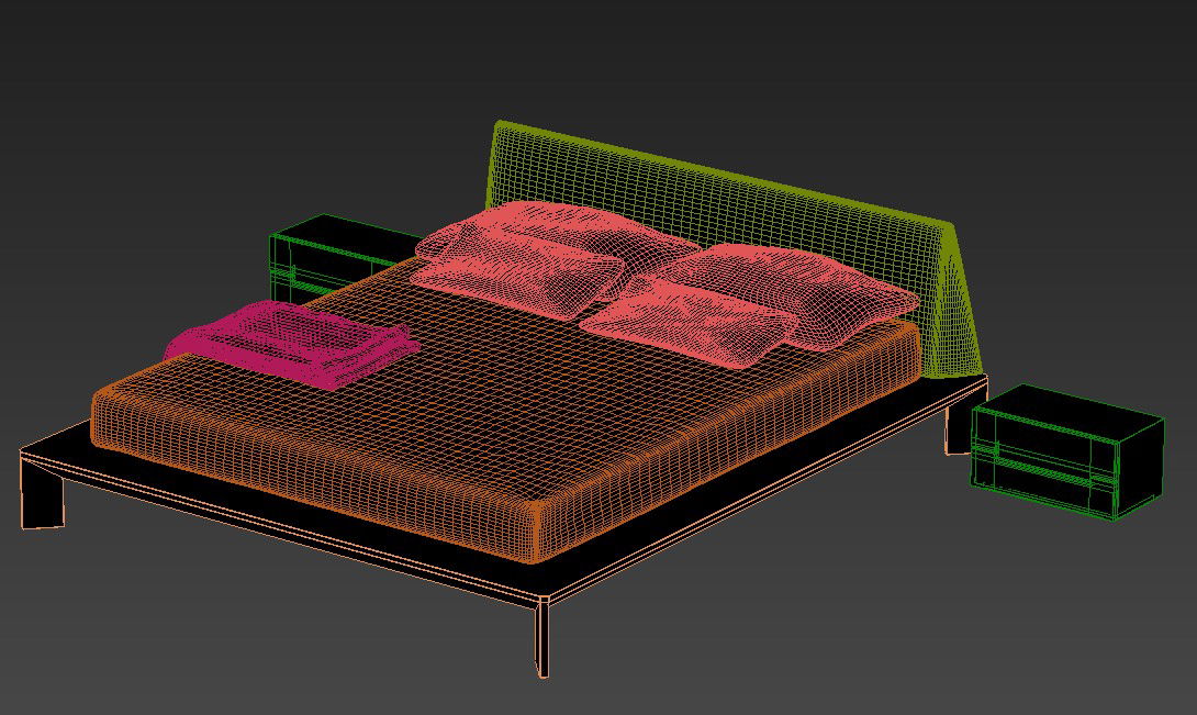 Double Bed With Soft Backrest And Side Table 3D MAX File; download in free 3d model of low height double bed with soft backrest, side table, and 5-inch mattress isometric elevation design.