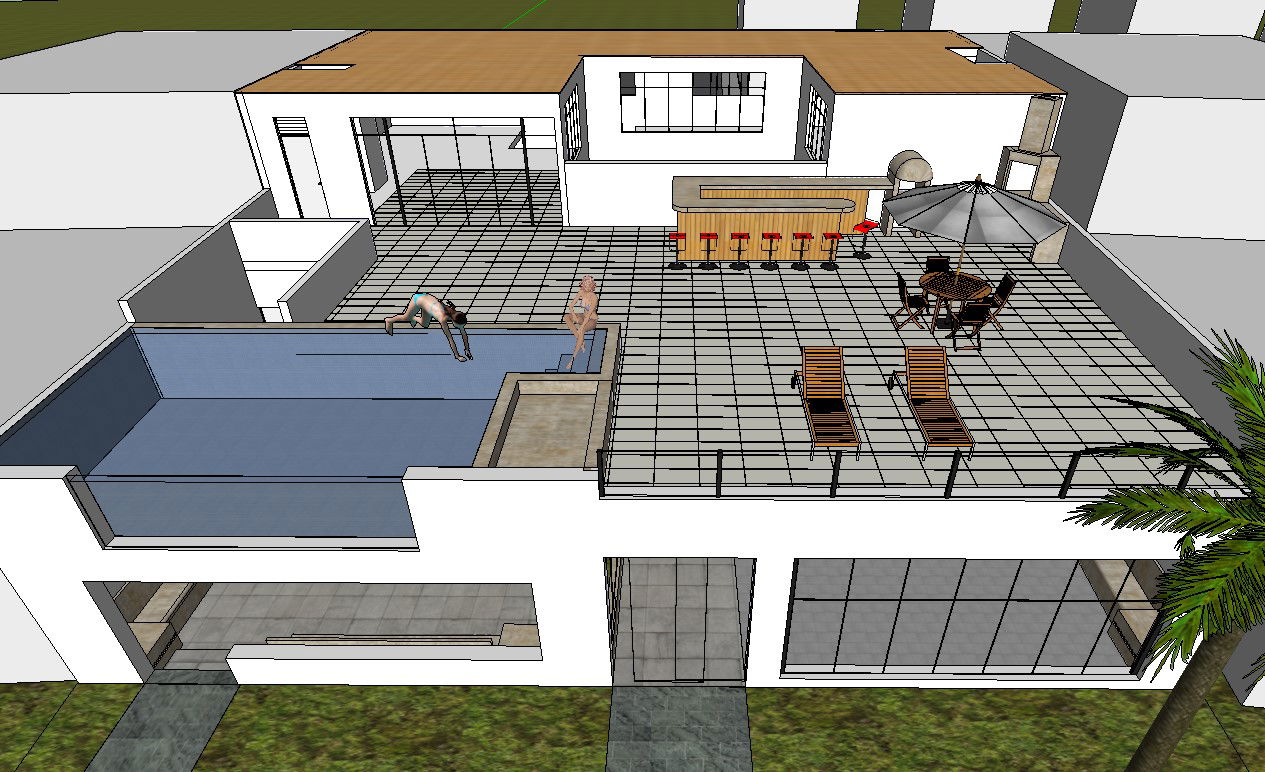 3D Beach House With Swimming Pool Design Sketch Up File; 3d model of beach house design includes bar counter table, dining table, rest pool chair, and swimming pool. download SKP 3d house design and use this modern new concept in your project.