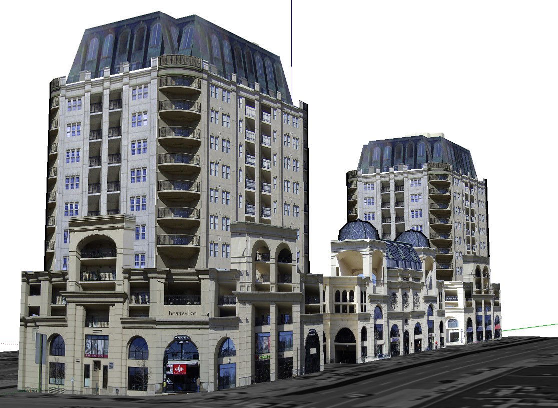 3D Commercial With Residence Building Design SKP File; 3d model of commercial with residence building elevation design shows ground-floor shops and office with market road. download sketch up file and get more detail about all side visualization day views.