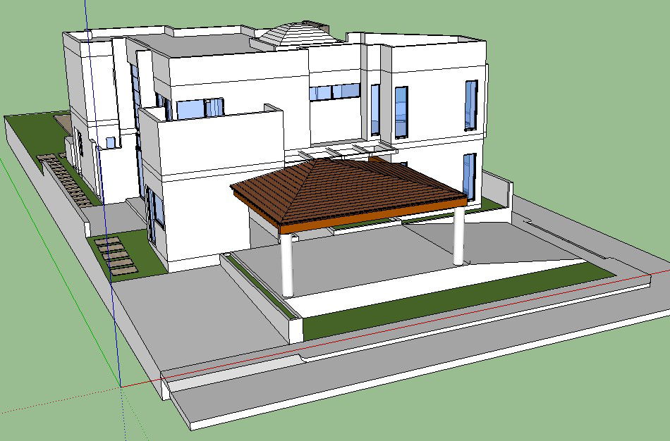 3d Modern White Bungalow Design Sketch Up File; the architecture 3d model of residence white bungalow front elevation design with front exterior decorative wood porch and landscaping design in Sketch-Up Format.