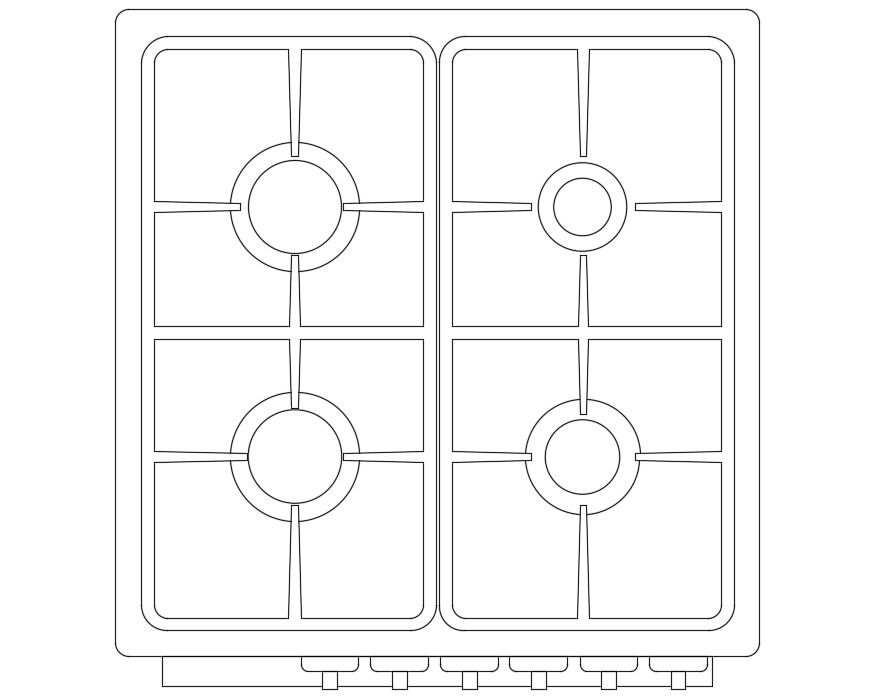 Top elevation design of kitchen equipment blocks details of four-unit gas-stove blocks AutoCAD drawing free download.