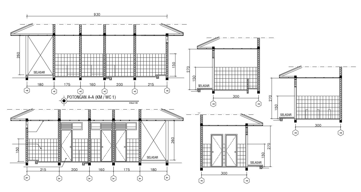 Toilet Four Side Wall Elevation With Working Drawing AutoCAD File Free Download; this is the four side elevation of toilet includes tiles design, door ventilation design, dimension details, centerline details, sloping roof details, plinth beam details, and much more details related to toilet section, its a CAD file format.