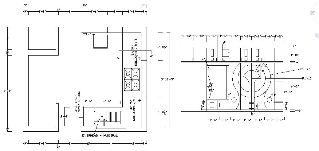 Kitchen Design in Lay-out detail & L.P.G valve connection line, Standing platform, & stove etc detail with dimension & interior design elevation include.