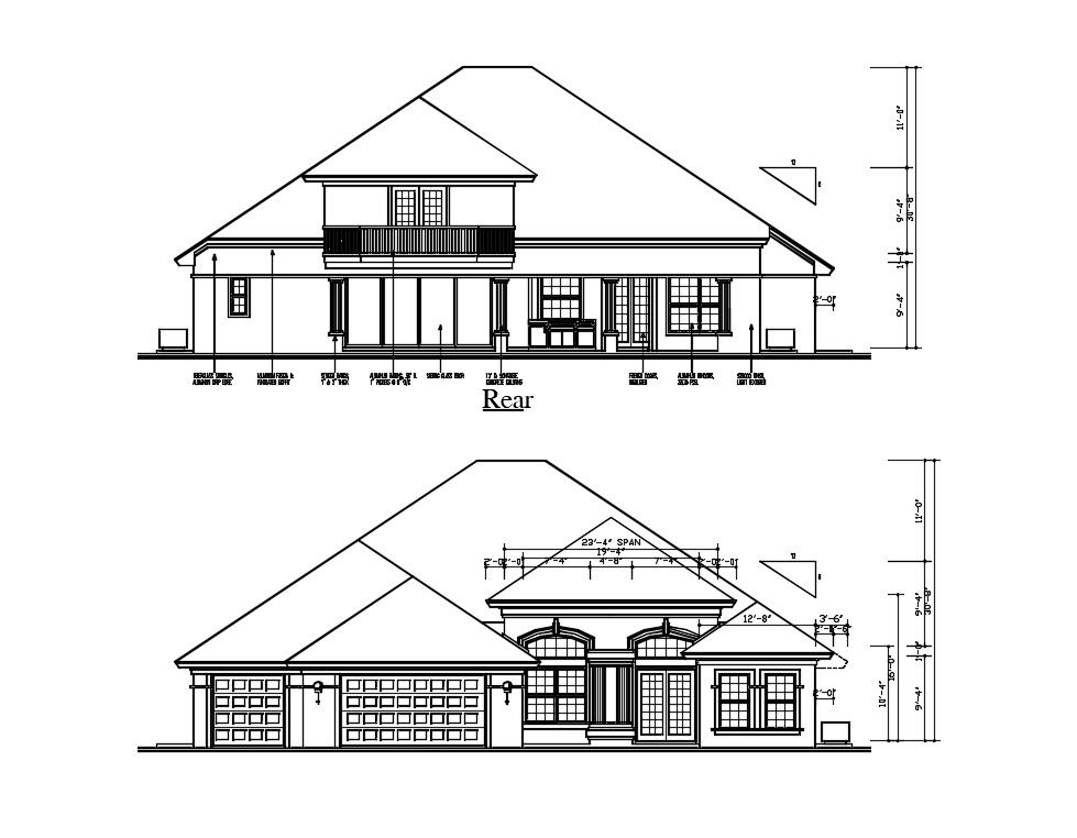 Rear And Front Side Sloping Roof Elevation Of Huge Bungalow AutoCAD File