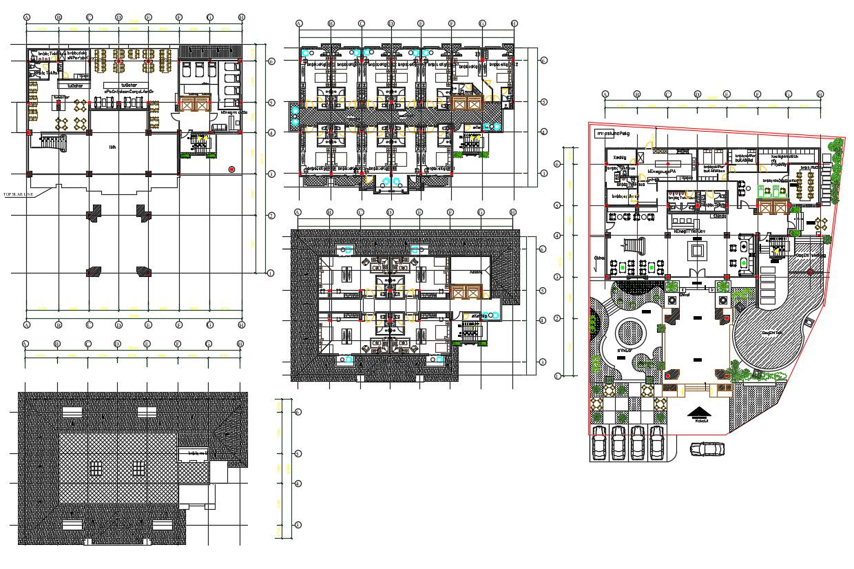 Different Floor Plans Of Hotel Building Design With Furniture Layout AutoCAD File; this is the all floors plan of related to hotel building includes the master plan with outer side landscape area, parking area, huge main entry foyer, reception, waiting area, toilet blocks, hotel room floor plan, restaurant plan, suit room and much more other details related to hotel planning, its a CAD file format.