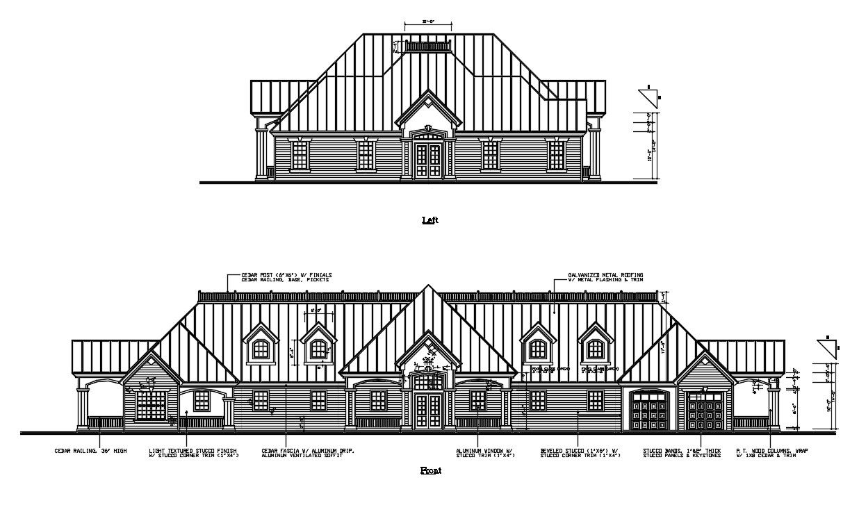 Traditional Sloping Roof Style Elevation OF Huge Bungalow AutoCAD File; this is the left and front side traditional elevation of bungalow includes different types of hatching, texting details related to material, floor dimension details, the main huge entry with double-height , big window, and doors in wooden and glass, and much more other details to ethnic elevation of house. this is the CAD file format.