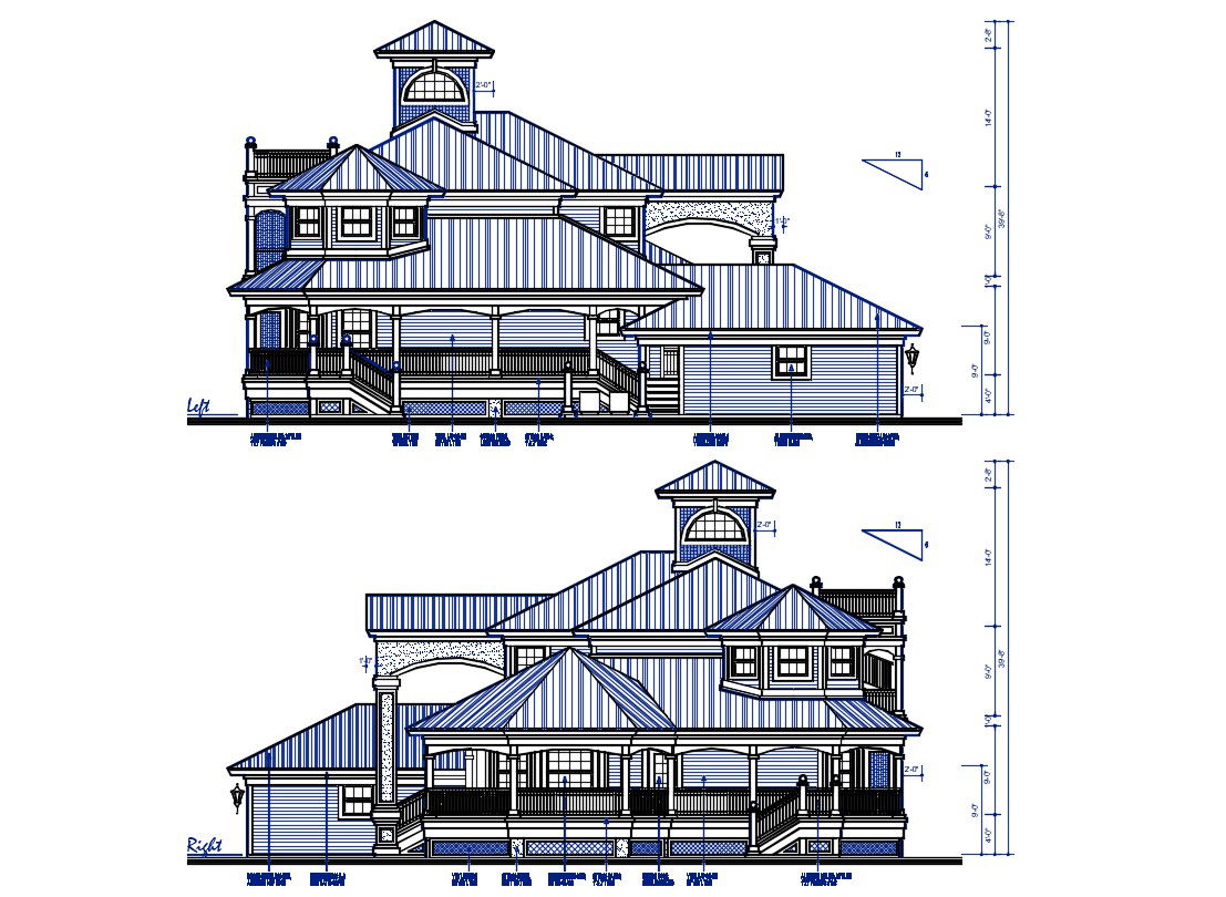 2D CAD Drawing Left And Right Side Elevation Of Huge Bungalow AutoCAD File; this is the two elevations of the huge bungalow with floor dimension, hatching details, texting details, the sloping roof at different slab levels, railing design, this is the traditional elevation, its a CAD file format.