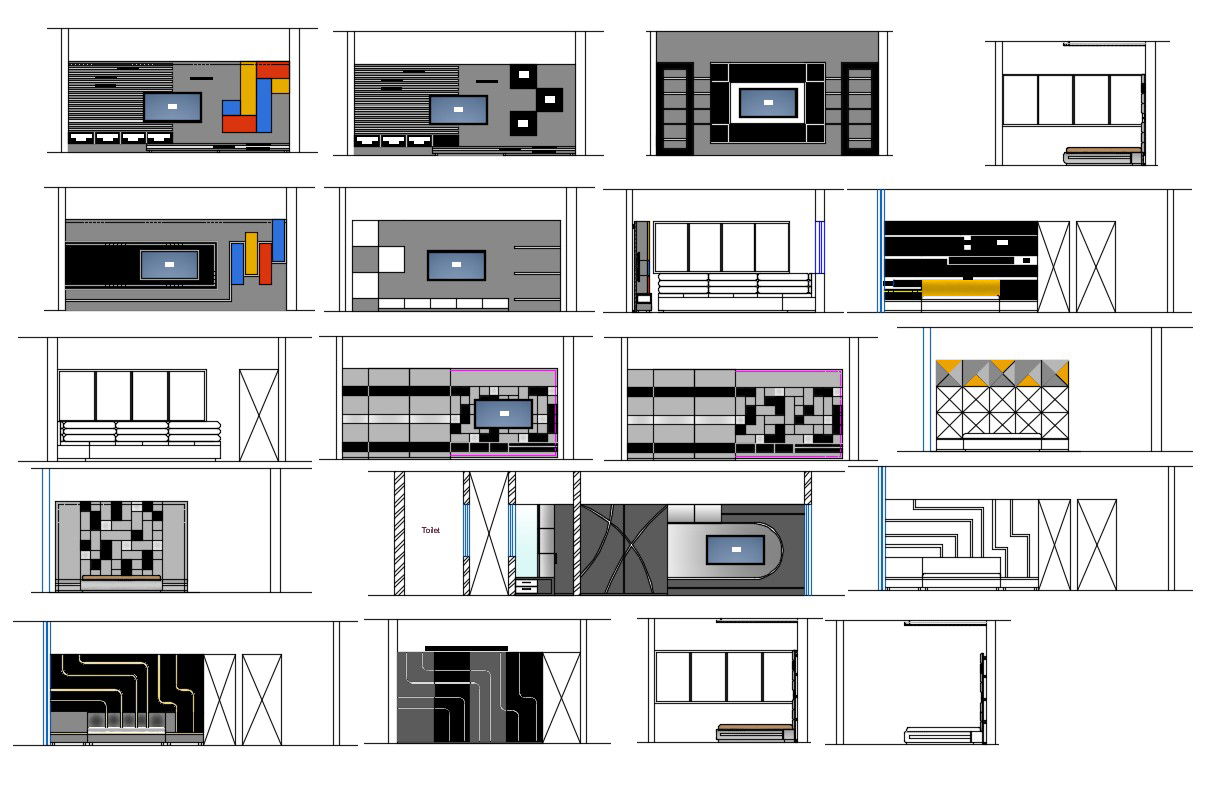 Drawing And Bed Room Furniture Interior Design AutoCAD File; this is the drawing-room and bedroom wall elevation includes TV unit, wall paneling with many options, hatching design, and many more other details related to interior, CAD drawing format.
