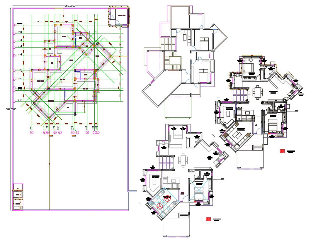 2D CAD Drawing Contemporary Bungalow Planning With Working Dimension AutoCAD File; this is the floor plan of the bungalow with modern architecture style design, this is the ground floor plan with furniture design, foundation details center line plan, excavation details, some dimension details in whether shade, its a CAD file format design.