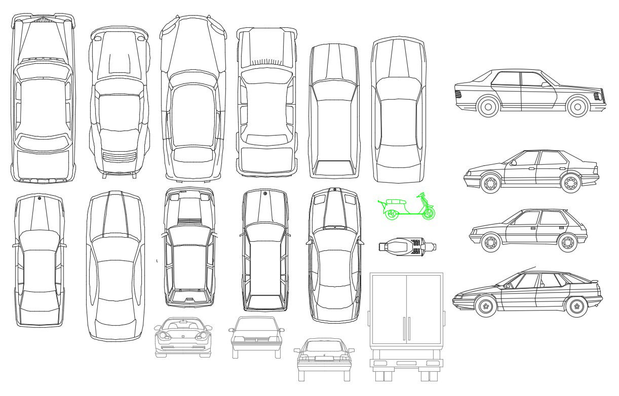 Car Vehicle CAD Blocks Download Free DWG File; 2d CAD drawing of vehicle CAD blocks shows car truck and scooter elevation design.